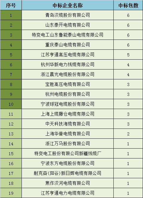 前十家电力电缆企业中标包数占总数的64%,分别是青岛汉缆股份有限公司、特变电工山东鲁能泰山电缆有限公司、杭州华新电力线缆有限公司、中天科技海缆有限公司、山东泰开电缆有限公司、浙江晨光电缆股份有限公司、重庆泰山电缆有限公司、江苏亨通高压电缆有限公司、江苏上上电缆集团有限公司、杭州电缆股份有限公司。